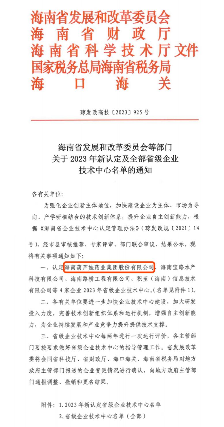 近日,海南省发改委等多部门联合公布了《关于2023年新认定及全部省级企业技术中心名单的通知》,其中,海南3377体育药业集团股份有限公司成功通过评审,被认定为省级企业技术中心,是本次获批的4家企业之一。